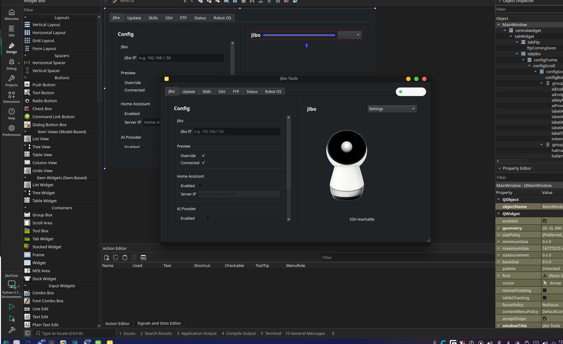 /var/jibo/identity.jsonto display the robot name. - The panel includes toggles/fields for Home Assistant and AI settings (currently UI-only wiring; the panel mainly focuses on connection + launching tools).